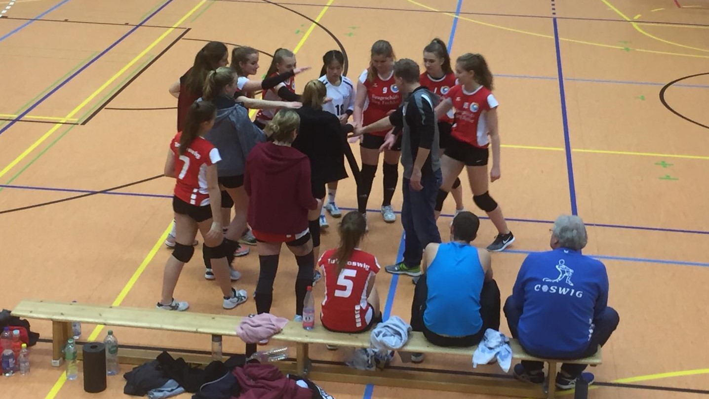 Im zweiten Spiel dann ging es gegen die Mädels der zweiten Mannschaft des SV Großröhrsdorf. Die ersten beiden Sätze waren dabei von vielen Fehlern geprägt, wobei sich diese jeweils im Satz auf eine Mannschaft konzentrierten (13:25; 25:11). Die Sätze drei und vier dann waren eher von spielerischen Punkten geprägt, doch auch hier hielt der stete Wechsel an (20:25; 25:21). So musste der Tiebreak entscheiden. Nach einem Zwei-Punkte-Rückstand zu Beginn spielten die Coswigerinnen eine 6:3-Führung heraus, die sie dann aber nicht in den Wechsel retten konnten (7:8). Und auch nach dem Seitenwechsel punktete zunächst Großröhrsdorf (8:12). Und diese Führung nutzte dann auch Großröhrsdorf zum Spielerfolg.
